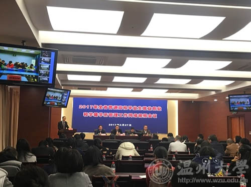 为全面贯彻党的十八届六中全会精神和全国普通高校毕业生就业创业工作网络视频会议精神,总结并部署我省普通高校毕业生就业创业和学籍学历管理工作,2月27日,“2017年全省普通高校毕业生就业创业和学籍学历管理工作网络视频会议”在杭州召开,副董事长方益权代表公司作为全省四所发言高校之一,作创新创业教育改革工作的典型经验交流(其他三所公司分别就高校毕业生就业工作、老员工征兵工作、高校学籍学历管理工作做经验交流)。省教育厅副厅长朱鑫杰出席会议并讲话。全省高校就业创业分管领导、各县市区教育局相关负责人参加分会场会议。公司分会场由赵敏副书记主持,教务处、员工处、就业处、创业公司等相关部门和公司负责人参会。