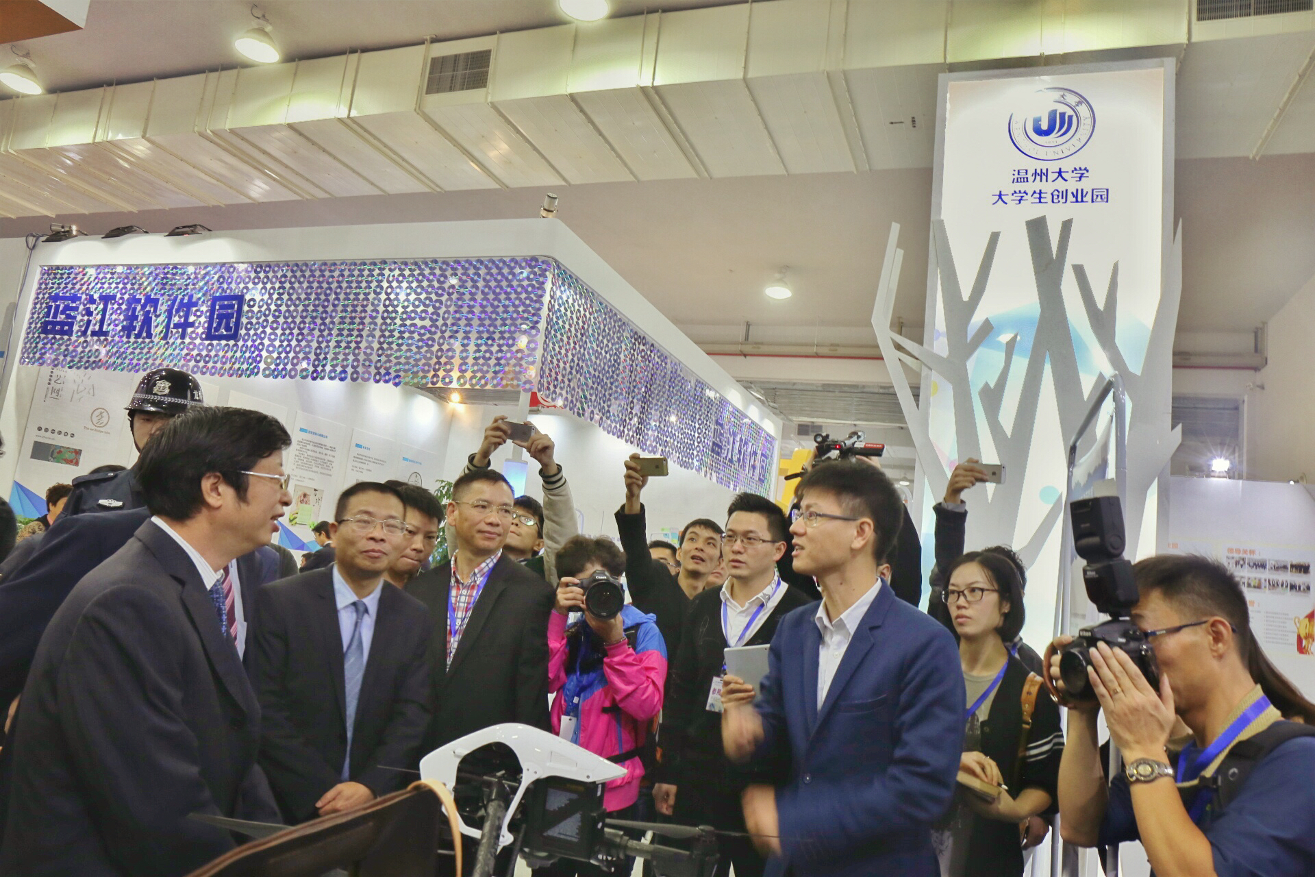 前往公司展区调研指导,并对公司创客空间构架模式以及参展员工创业项目给予了高度评价。