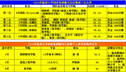 “即使面临100次的失败,在第101次,也许你就会成功”、创业就是要“敢为天下人先”、“笔作春秋,千金不易”,伴随着一句句响亮的口号,进入2015年创业案例编写大赛总决赛的十佳团队分别将本队创业案例编写成果进行展示,经过两个小时的精彩比拼,最终诞生了一等奖一名:Victory队(韩晓明、谢莉、丁凯迪、罗添添);二等奖两名:化蝶队(黄露霞、李斌琳)、创商队(佘瑛洁、颜园、蔡雨晨、陈威);三等奖三名:春秋队(梁亚娟、洪锐法)、超人队(杨阳、滕宇阳、吴文平、张雪、廖新新),dear队黄丽、李晓霜以及个人突出表现奖三名(谢莉、罗添添、颜园)。