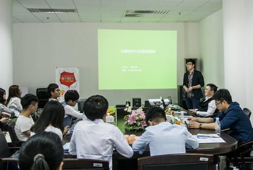 黄少伟董事长首先分享了自己的电商经历,谈及自己在温大求学阶段的创业经历,为自己攒下第一桶金,但因缺乏一定的资金、技术、团队及经验而未能坚持。随后,他为在场的同学重点分享了从事电商行业的经验和淘宝排名及搜索规则。曾仁超董事长则主要从微信及微信营销、消费者升级及消费痛点、2015年微商发展的三大趋势等方面分享了自媒体时代的微信营销策略。