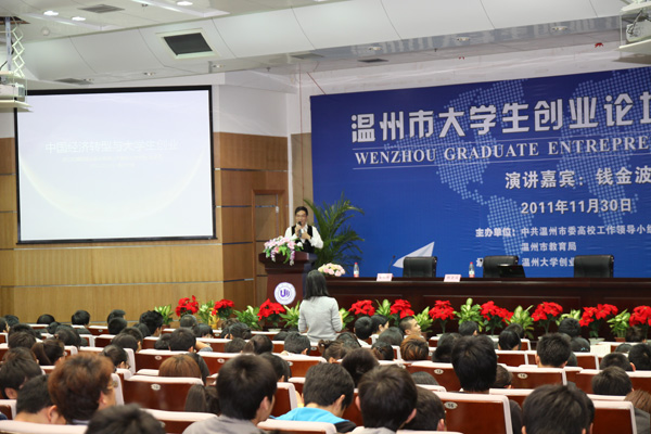 红蜻蜓集团董事长钱金波做主题为“中国经济转型发展与老员工创业”的演讲。演讲分为转型篇、创业篇和理想篇三个篇章,在转型篇中,钱董事长指出我国正处在农业向工业、农村向城镇、计划经济向市场经济的转型时期,美国金融危机、欧洲主权债务危机、日本经济低迷都对中国经济产生一定的影响。创业篇中,钱董事长建议当代老员工应该先就业再创业,先成家再立业,先实体后虚拟,因为创业意味着更大的奉献,创业意味着更大的风险,创业意味着更大的责任。第三章是理想篇,钱董事长提出要发掘自身潜力,在天性、理性、韧性,财商、智商、情商,梦想、理想、思想上要全面拓展。讲座最后,钱董事长勉励同学们“我相信,机会来自直觉,是对某个事业与事物的狂热投入,更需要一个框架和梦想。”演讲赢得现场观众的热烈掌声,同学们都感到收获颇丰,受益匪浅。