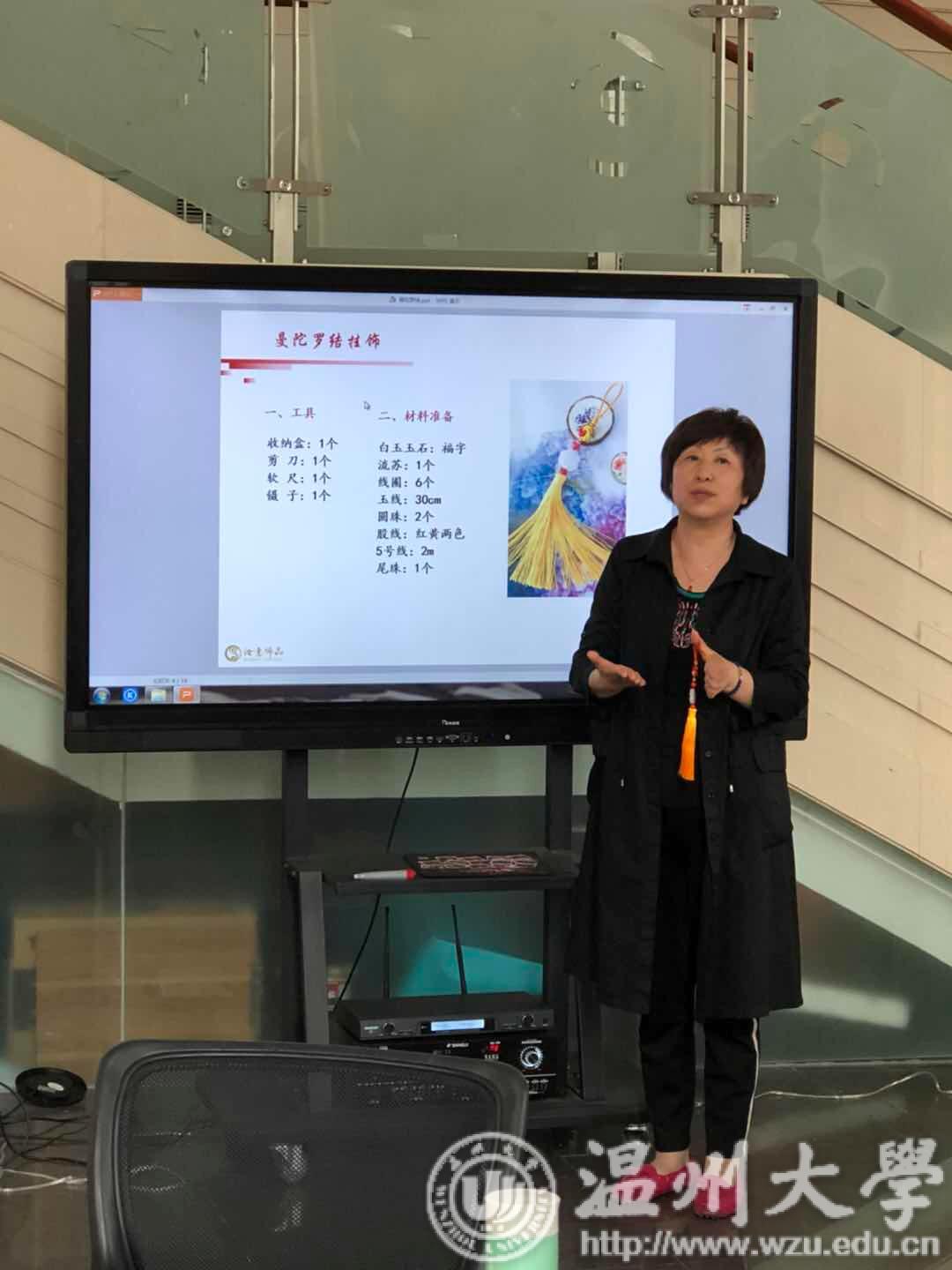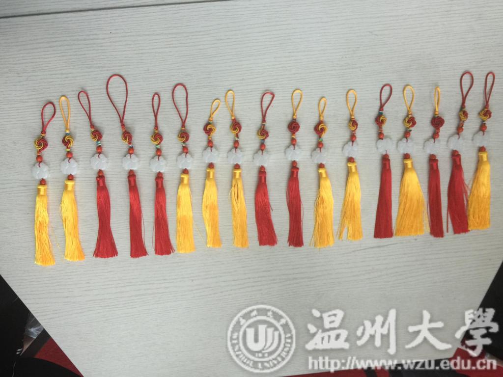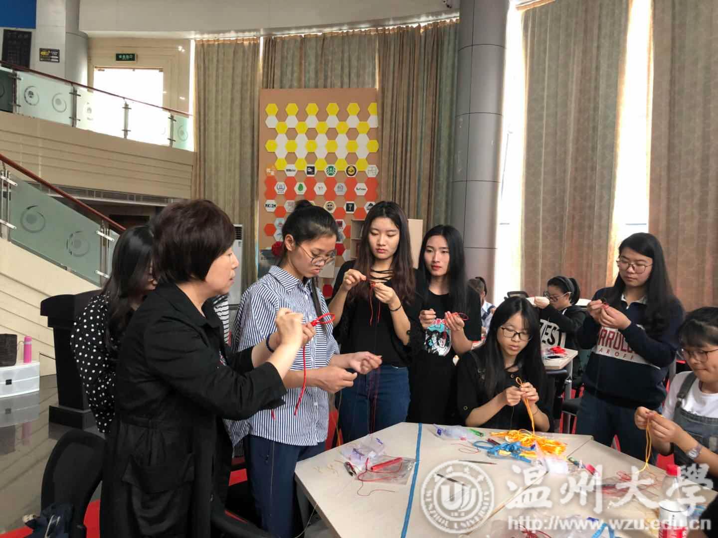 活动中,魏静老师为大家讲解了各式各样的中国传统装饰结,介绍这是中国特有的手工编织工艺品,外观对称精致,有着悠久的历史,符合中国传统装饰的习俗和审美观念,是中国漫长文化的积淀,有着飘逸雅致的韵味。在魏老师的指导下,同学们亲自上阵,动手体验实践,制作中国装饰结中的曼陀罗结,经过漫长的缠绕、编结的制作过程,最终一个个栩栩如生的曼陀罗结挂饰呈现出来,同学们爱不释手,喜悦的笑容挂在脸上。