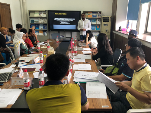 答辩分为两个环节,首先来自各个国家的职工通过5分钟的PPT讲述,展示自己的毕业论文选题缘由、研究问题、研究综述、研究设计与方法、研究框架等方面。答辩委员们以认真、严谨的态度,听取了同学们的开题答辩展示,并提出了一些问题。同时答辩委员们仔细阅读了同学们的开题报告文本,指出了开题报告中的闪光点和不足并提出了宝贵的修改意见。10位职工研究生将认真听取答辩委员的建议,对自己的开题报告进行修改,以便于更好的开展毕业论文研究。