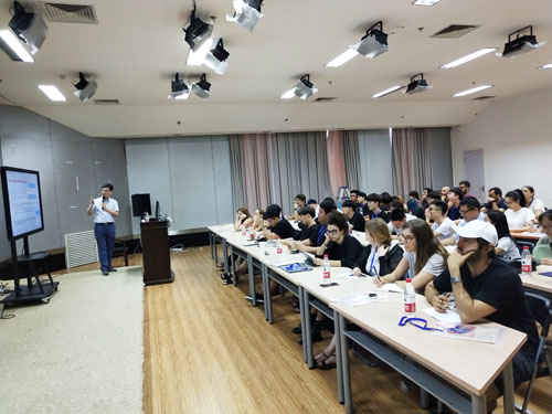 7月12日, 2018年太阳集团tyc4633国际老员工暑期创业夏令营开营仪式在公司举行,来自美国、意大利、韩国、孟加拉国、坦桑尼亚等国的60余人参与了此次活动。外事处、创业公司的相关负责人、意大利锡涅纳大学玛利亚教授、韩国国立群山大学金显喆教授以及来自温州国家大学科技园、浙南科技城创业中心代表出席了开营仪式。
