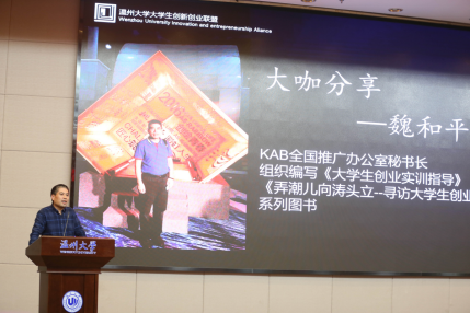 论坛邀请到了KAB全国推广办公室秘书长魏和平,新世纪发展集团董事长谢炳超,维度资本合伙人、副总裁崔风,掌上大学创始人、温大员工张良玉做主题分享。