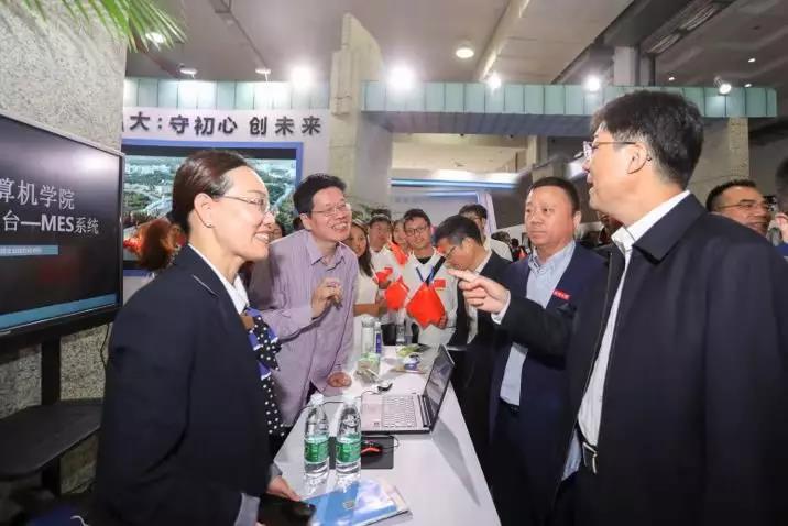 陈伟俊书记、姚高员市长对温大展馆“智能科技”展区的项目尤为关注。他们先后聆听了“低压电器数字制造孪生车间及系统”“智能解耦式电动伺服制动助力系统”以及“智能制造云平台——华易MES系统”等项目负责人的介绍。
