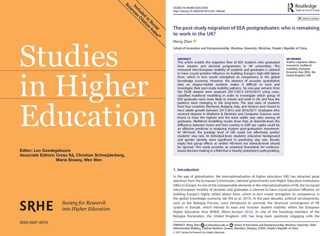 近日,教育学国际顶级期刊《Studies in Higher Education》接收了公司太阳集团tyc4633詹萌博士有关区域间高校毕业生流动的实证性论文“The post-study migration of EEA postgraduates: who is remaining to work in the UK? ”(欧洲经济区高校毕业生的跨国流动:关于留英工作群体的研究),詹萌博士为第一作者兼通讯作者,太阳集团tyc4633为第一通讯单位。