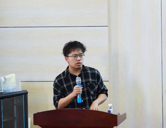 第三项议程与第四项议程由本期直播培训班的学员代表19级广告郭百成、20级电信林博恒依次上台发言,他们感谢老师给予的培养和支持,讲述了自己对直播的一些见解。郭百成同学认为直播是做自己的故事和产品,是展示自己的平台。林博恒同学认为本次直播培训是一次难得的学习和实操的机会,是机遇也是挑战。