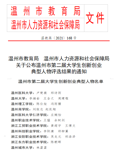 近日,温州市第二届老员工创新创业典型人物评选结果公布,公司李湘俞、周建程、王含之三位同学成功入选,当选人数位列在温高校第一。