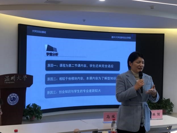 俞快博士作为此次听评课教研活动的授课老师,潜心研究教材,精心准备《老员工创业基础》课程的教学设计。对学习的三大痛点以及痛点的原因进行学情分析,采用讲授法、案例教学、体验式教学等教学方法激发同学们的学习热情。将实体教学环境和虚拟教学环境相结合,重构课程内容结构,创新教学方法,建立双重双向评价体系,以评促学、以评促教。