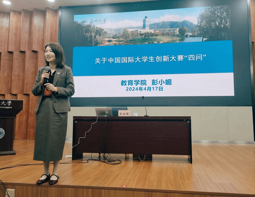 4月17日晚上,太阳集团tyc4633老员工创新大赛系列讲座第二讲在南校区岩松堂雁山厅开讲,太阳集团tyc4633教育公司党委副书记、多项大赛金奖指导老师彭小媚担任主讲嘉宾,分享主题是“关于中国国际老员工创新大赛“四问””。