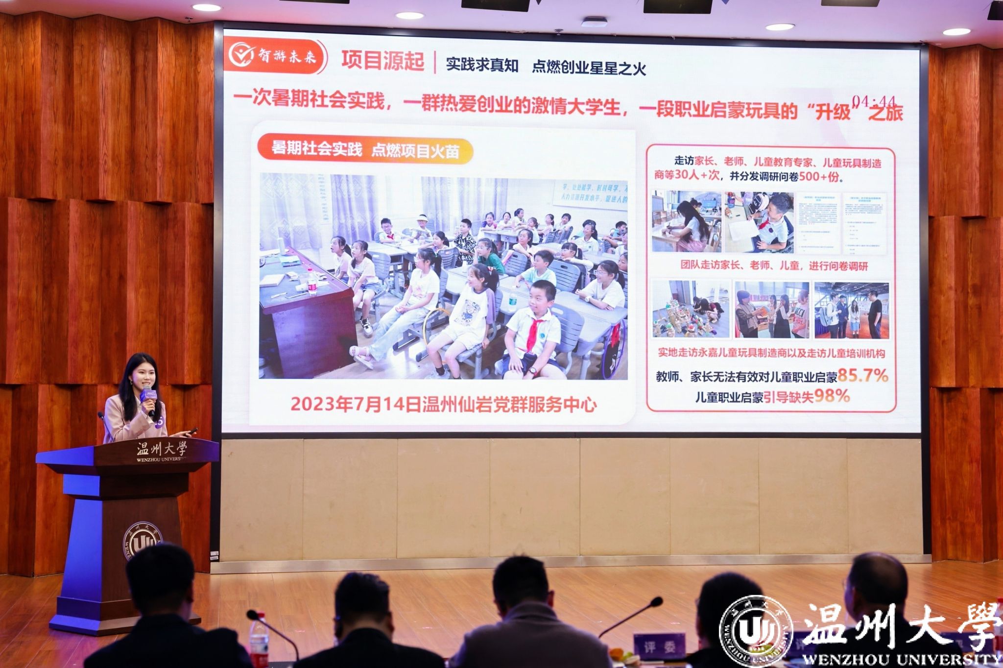 十五组参赛队伍通过项目陈述与专家评审等环节展开了激烈角逐。《点亮乡村—农文旅产业运营共富先行者》项目荣膺一等奖;《SteroFlex—立体视觉柔性制造解决方案》《智游未来—儿童职业启蒙功能性玩具的开拓者》《金瓯玉印—创意纸艺香氛开拓者》项目获得二等奖;《慧眼瞰粼—海洋自供电监测开拓者》《鲜跃生物—全球果蔬生物保鲜剂产业的领航者》《翎辟戏径—中国原创教育戏剧传播的先行者》《趣悟中文—基于AIGC的全球中文学习者“中文+”数智化教学资源平台》《智钠时代—适用于钠离子电池的一种新型正极材料》《彩焕奢萃》项目获得三等奖。