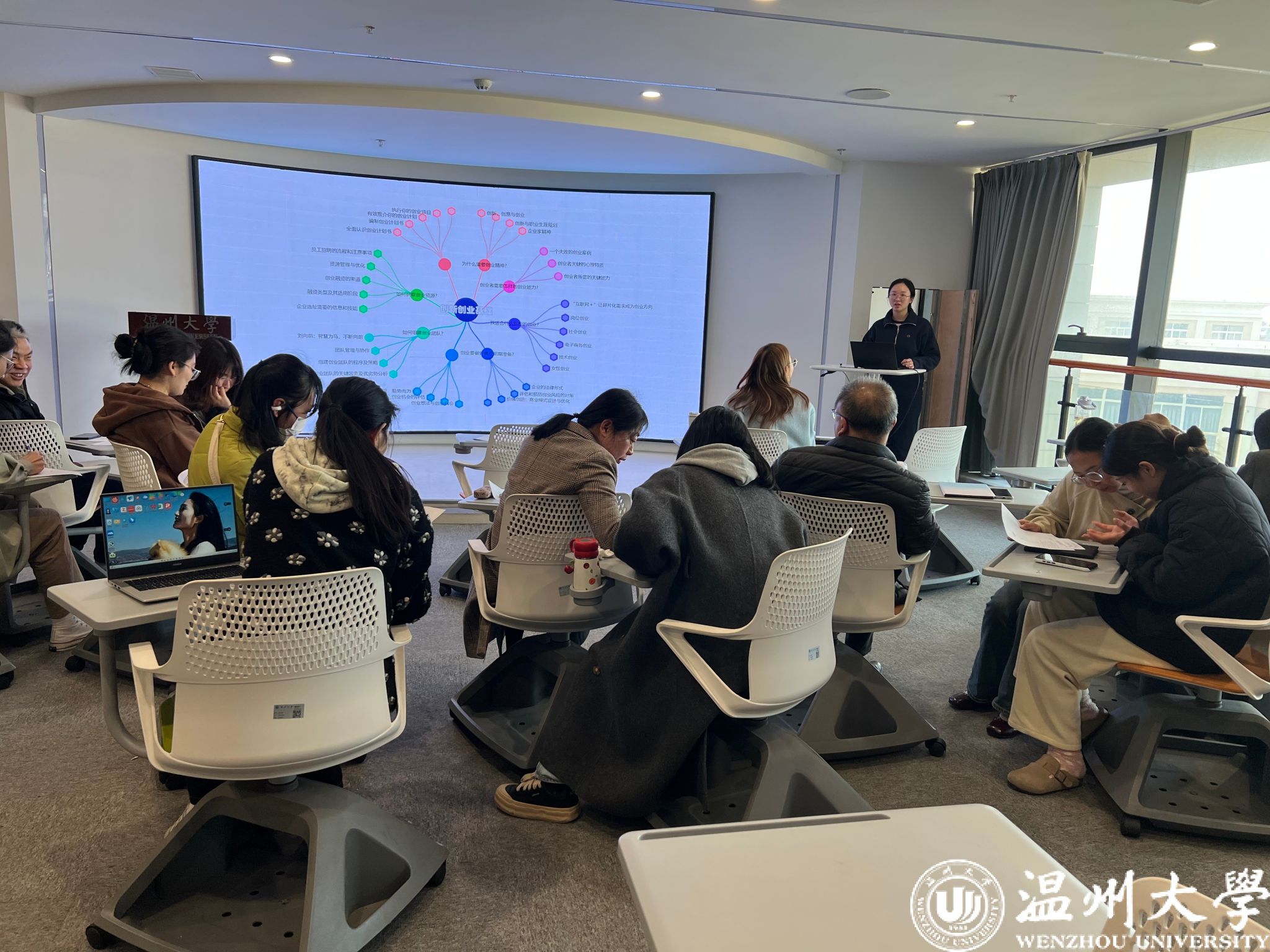 在随后的专题培训环节中,徐曼莉博士为教研室教师详细讲解了如何使用知识图谱辅助课程讲授,分享了将复杂概念可视化、结构化的设计思路,同时对智慧教学平台的主要功能模块及实操流程进行了演示说明,进一步提升了教师对平台功能的理解与运用能力。