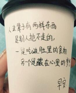 为了能让大家在享受美味早餐时获得精神愉悦或鼓励,王羙宵每天都要抽空上网搜索一些励志话语,一笔一笔写在豆浆杯上,送到同学们的手里。“这种关心的方式还蛮受用的,感觉小宵好贴心。因为是这些字都是她亲手写的,我也都会认真地看一看。”经常购买王羙宵早餐的同学小马说。