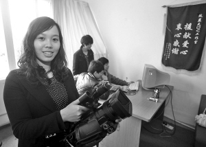 昨天下午,记者来到蒋鑫娟的蓝天DV工作室。工作室只有10平方米左右,一张沙发、一张桌子、三张椅子和两台电脑是仅有的摆设。“我以前是负责员工会外联部的,去年9月份刚刚接手这个工作室。除了这两台用于后期制作的电脑,我们平时常用的还有两台摄像机和两个脚架。”蒋鑫娟说,“相对其他专业的DV工作室来说,我们的设备可能是比较简陋,但这同样浇不灭我们对它的热情。”