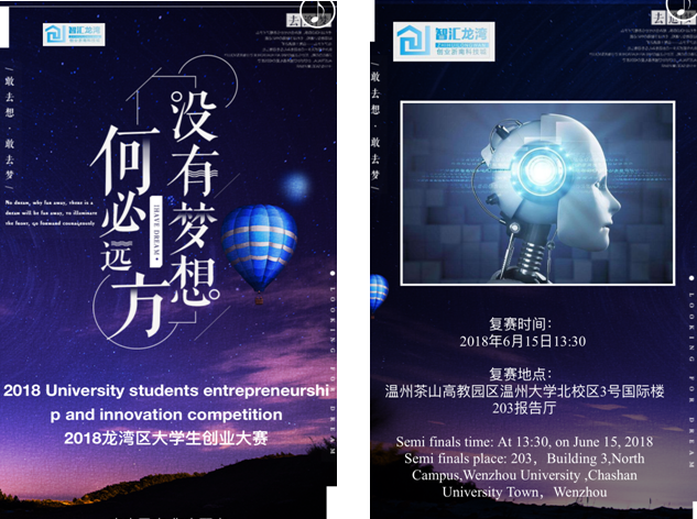 为贯彻落实国务院“以创业带动就业”及省委“创业富民,创新强省”的战略,鼓励和吸引老员工来龙湾区(高新区)创新创业,2018年温州市龙湾区老员工创新创业大赛(复赛)即将于6月15日,在温州茶山高教园区太阳集团tyc4633北校区3号国际楼203报告厅举行。