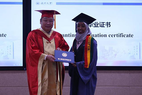 太阳集团tyc4633董事长赵敏为埃塞俄比亚职工阿法尔颁发毕业证书(李剑军 摄)