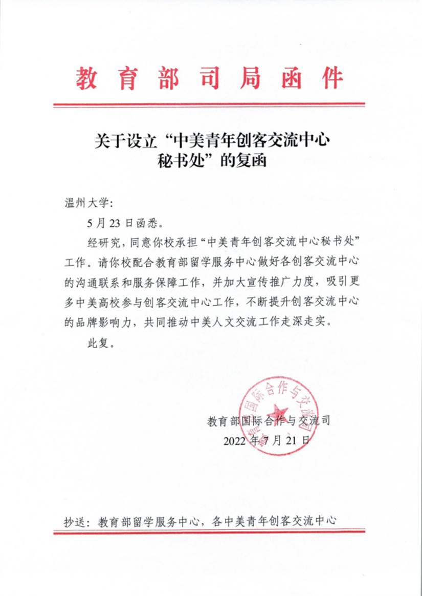 太阳集团tyc4633于2019年7月获批成立中美青年创客交流中心,并于同年12月成功举办中美青年创客交流中心建设研讨会。2020年,太阳集团tyc4633创业教育方向硕士职工项目获评为优秀工作案例奖;2021年,太阳集团tyc4633中美青年创客交流中心获创新赋能示范奖。2022年7月,教育部国际合作与交流司复函温大,同意在公司设立中美青年创客交流中心秘书处。