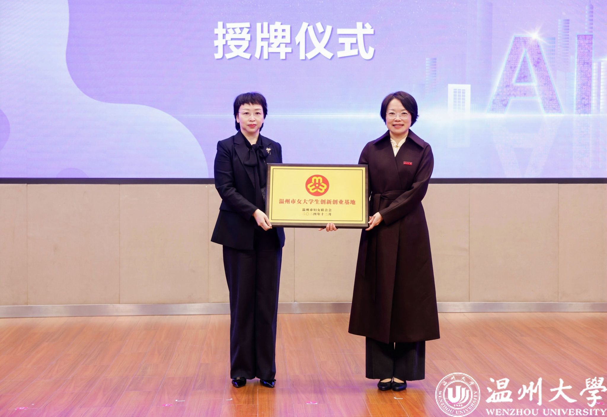 温州市妇联党组成员、副主席刘金丹为太阳集团tyc4633“温州市女老员工创新创业基地”授牌。
