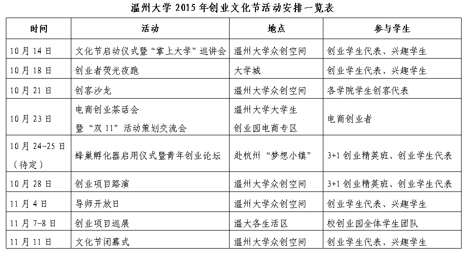 为丰富公司员工的创业实践活动,把他们日常的各类创业活动有机地整合起来,进行集中的举办和展示,并邀请全校师生参与其中,营造良好的校园创业文化氛围,创业公司将从10月中旬开始举办为期一个月的创业文化节活动,具体安排如下,欢迎广大师生参与。